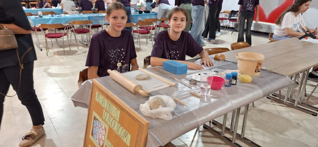 Petra i Luna pred Državnim su povjerenstvom izvrsno prezentirale “Kotačac” i naš ovogodišnji proizvod, medaljon s glagoljicom. Premda Državna smotra u svom izložbenom dijelu nema natjecateljski karakter, veliko nam je zadovoljstvo što smo dobili pohvale za estetski izgled izložbenog prostora, djelovanje učeničke zadruge, suradnju s lokalnom zajednicom i izvođenje praktičnog rada pred članovima Državnog povjerenstva.